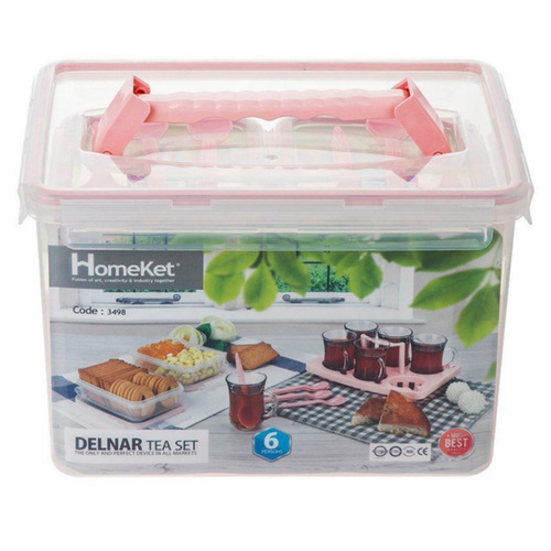 ست چای خوری 6 نفره دلنار برند هوم کت بسیار سبک و نشکن میباشد. با توجه به این ویژگی برای سفر و پیک نیک مناسب است. با توجه به دسته تعبیه شده روی سبد قابلیت حمل آسان دارد. این سبد زیبا 15 پارچه می باشد که شامل 6 عدد لیوان و 1 عدد استند لیوان و 6 عدد قاشق چای خوری و 2 عدد ظرف دربدار برای قرار دادن قند و نقل و شیرینی و ....است.