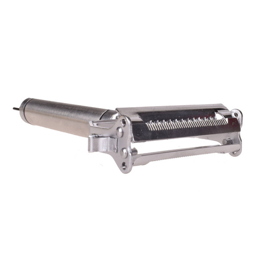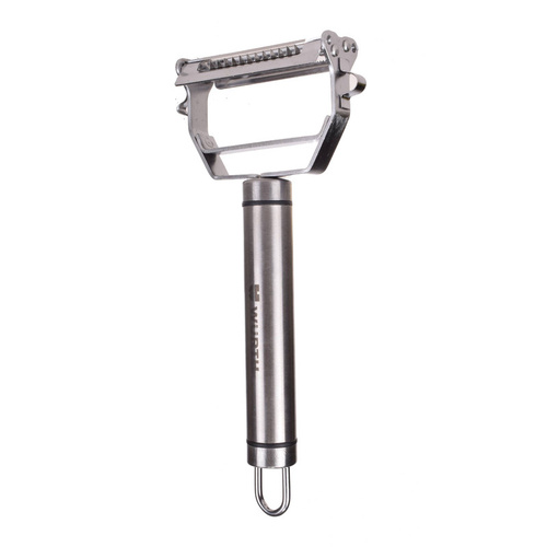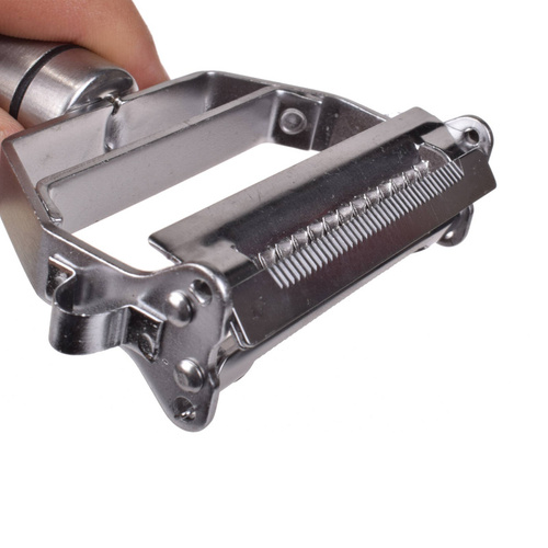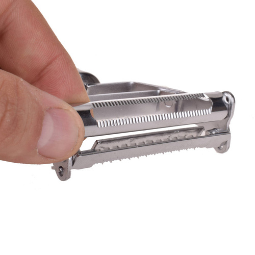 محصولی بسیار عالی با تیغه استیل ضد زنگ که یک سمت سری ان تیغه مخصوص پوست کندن و یک سمت سری هم تیغه های تیز برای رشته کردن خیای و هویج و کدوو...